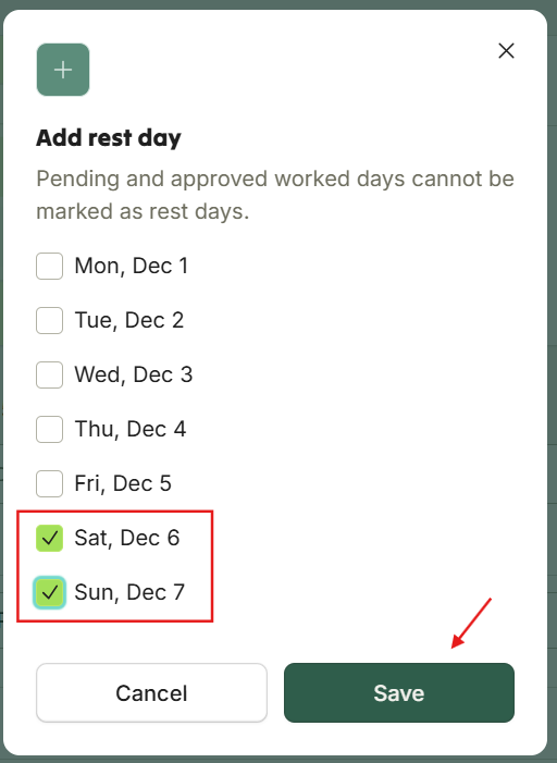 2. Select the day(s) you want to mark as rest days. Click “Save”.