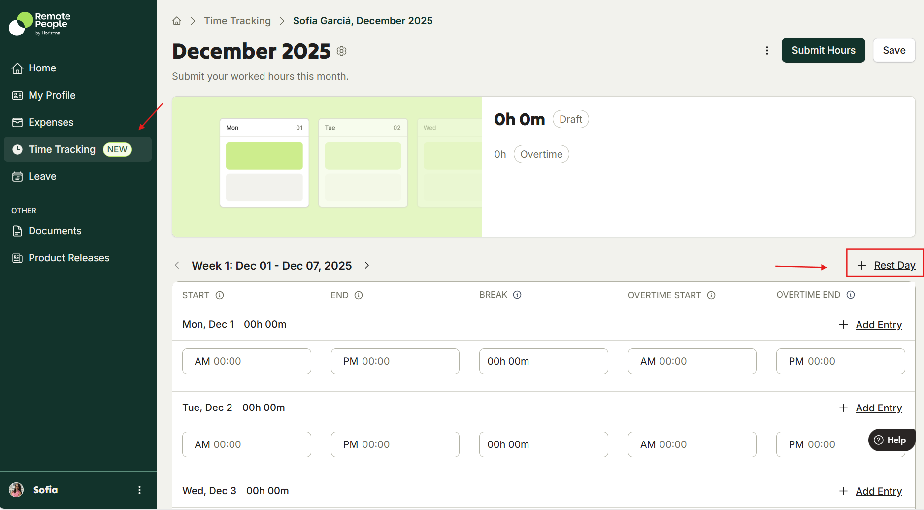 - Open your monthly timesheet. Click “+ Rest Day”.