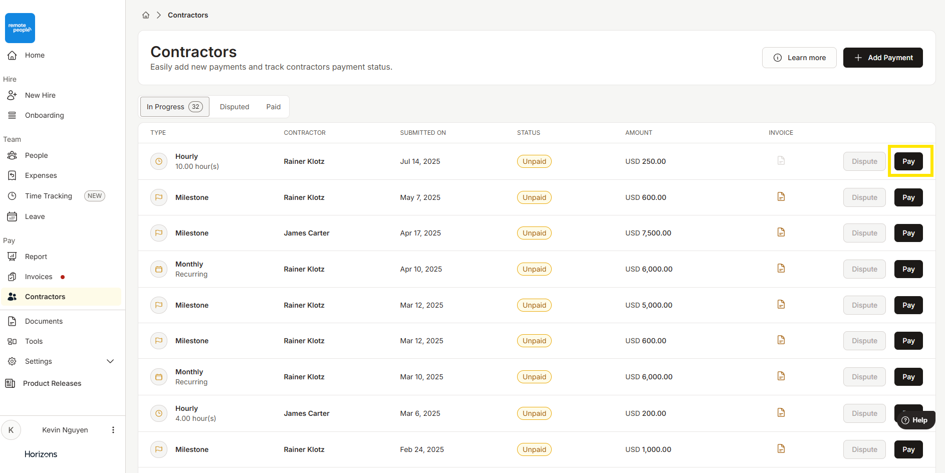 At Horizons, clients have the ability to raise one-time invoices for contractor payments quickly and easily through our platform. This feature supports milestone, hourly, or daily payment types, allowing you to manage payments flexibly while maintaining full transparency.