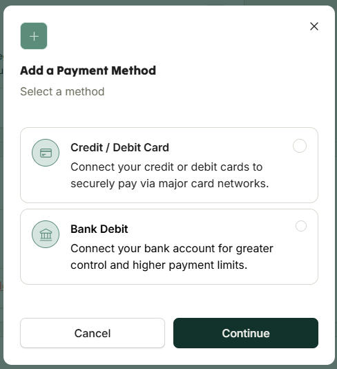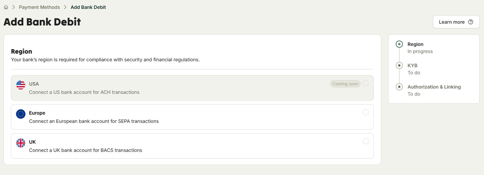 Note: Direct Debit (ACH, SEPA, BACS) is available only in regions where banking regulations permit it.